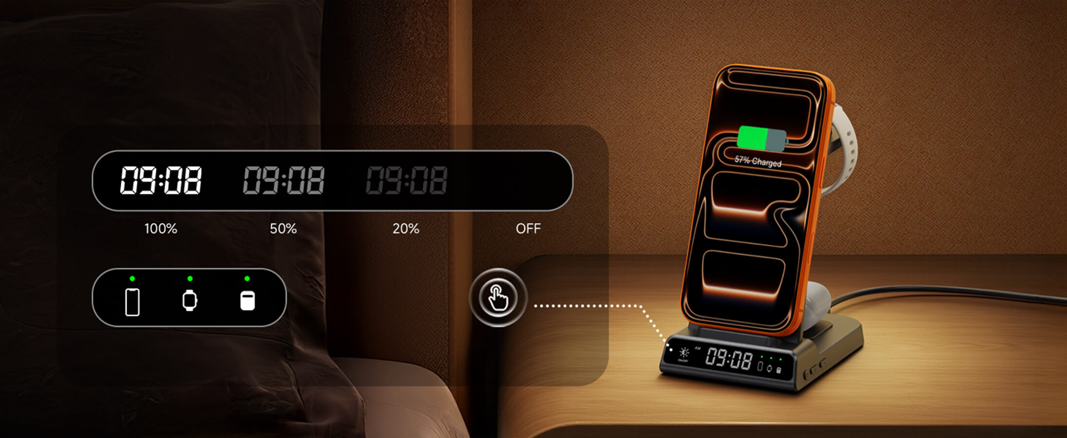 Hodiny s nastavitelnou jasností, ideální pro noční zobrazení, zajišťující plné nabití vašich zařízení každou noc