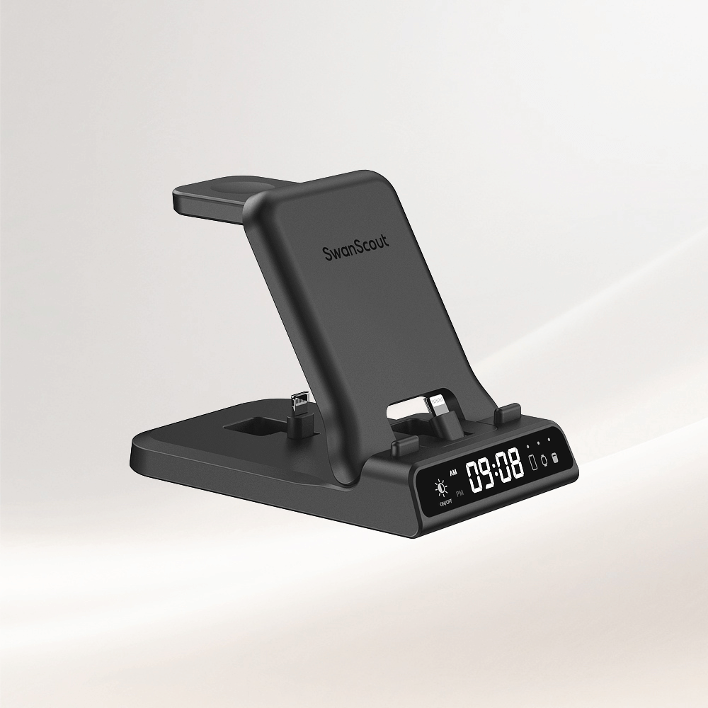 SwanScout 701A is a 3-in-1 wired fast charger compatible with Apple phones, watches, and earbuds, offering stable and efficient charging in one sleek unit.The swanscout 701A is a stylish alarm clock with cell phone charger, combining fast charging with a digital time display for added convenience.