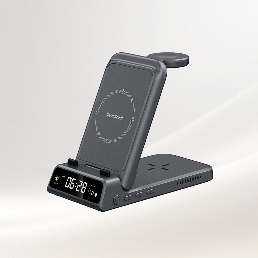 SwanScout 502M is a slim, 2-in-1 magnetic wireless charger compatible with Apple devices.The SwanScout 502M combines a sleek 2 in one clock phone charger design with an LED display and fast charging for daily convenience.