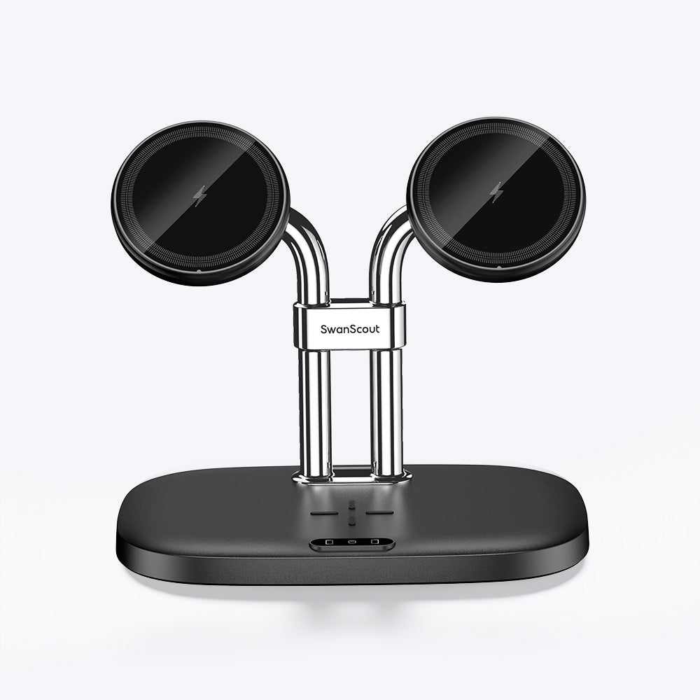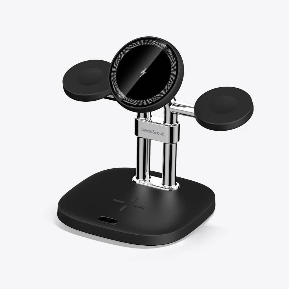 SwanScout 709M - 4-in-1 Magneettinen Langaton Laturi Applen LaitteilleElevate your setup with the SwanScout 709M, an elegant Apple Watch charger stand made for modern users.