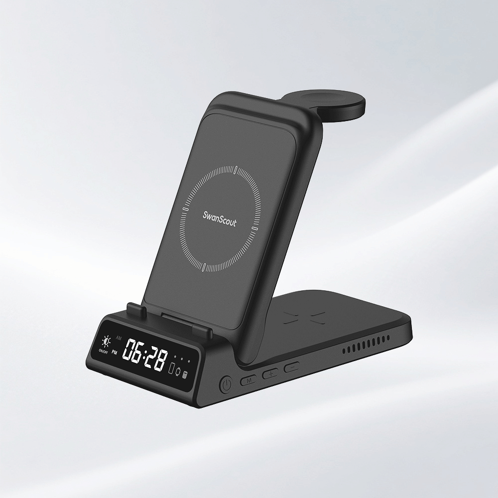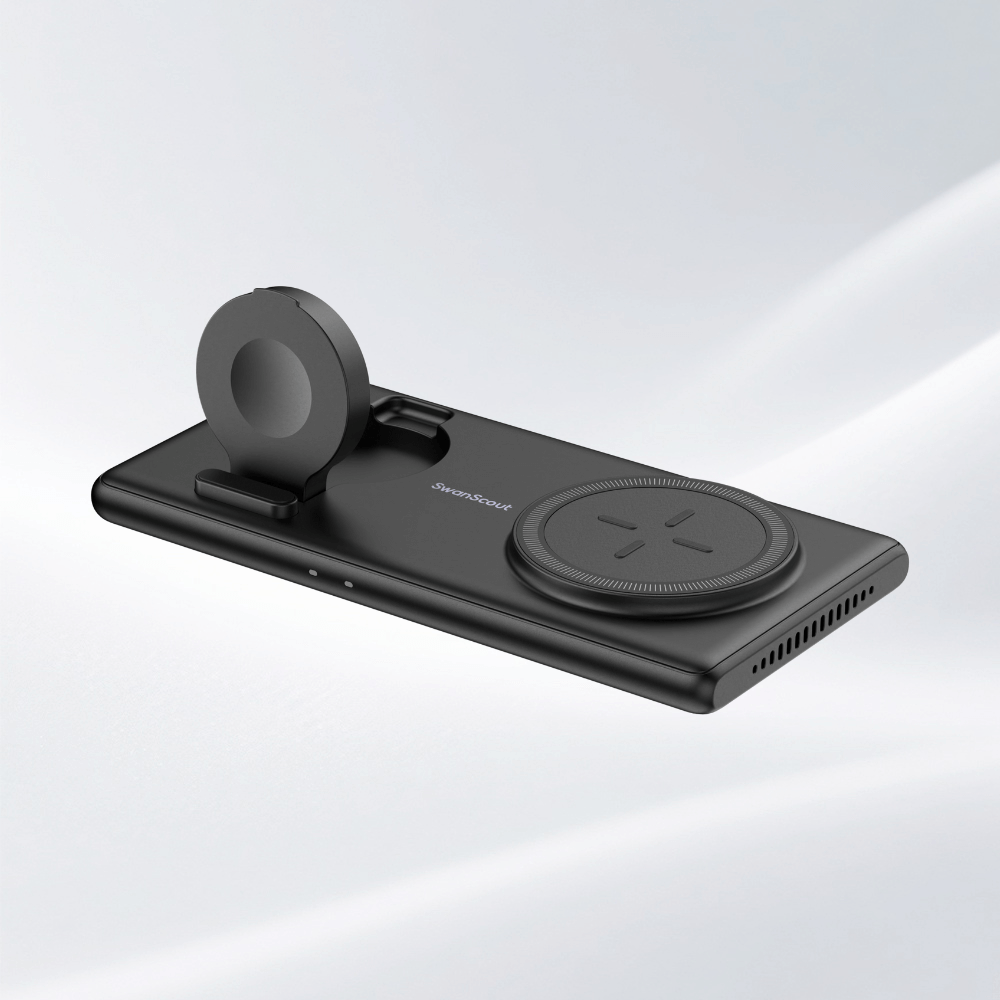 La stazione di ricarica 3 in 1 di SwanScout supporta dispositivi non Apple compatibili con gli standard di ricarica wireless (ad esempio, alcuni telefoni Android e auricolari wireless) per le aree dedicate al telefono e agli auricolari, ma l'area dedicata all'orologio è esclusiva di Apple Watch. Per la ricarica magnetica, i dispositivi precedenti all'iPhone 12 richiedono la compatibilità magnetica o una custodia magnetica.