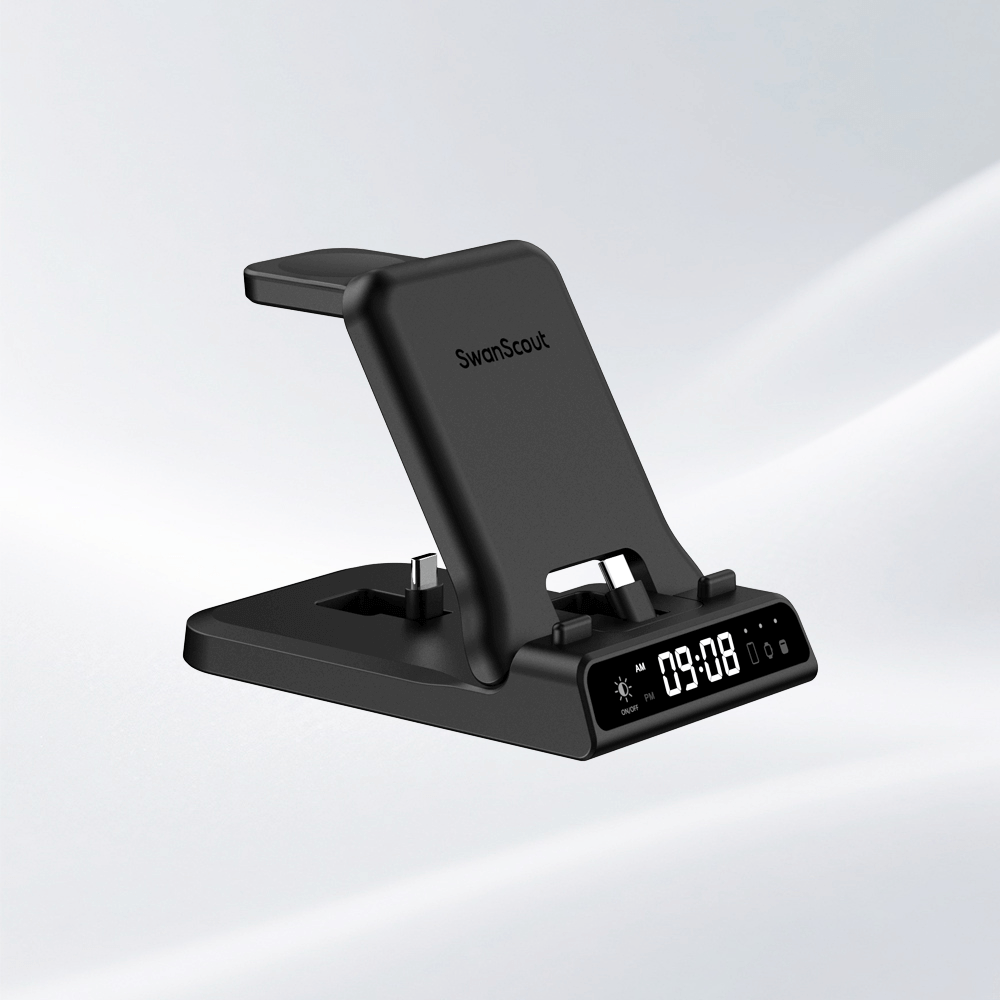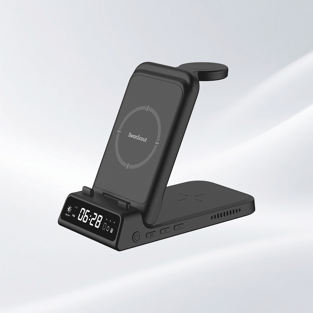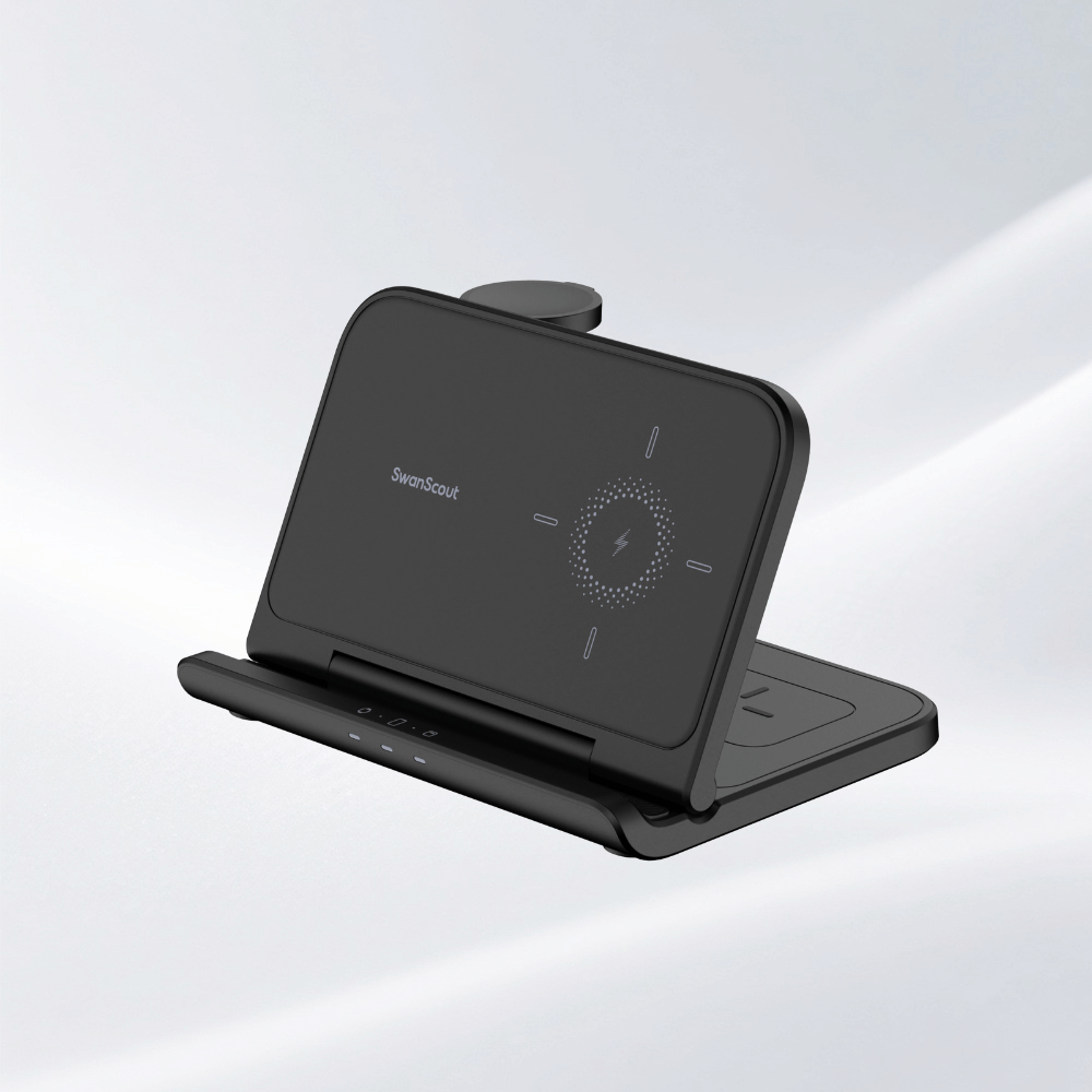 La stazione di ricarica 3 in 1 di SwanScout supporta dispositivi non Samsung compatibili con gli standard di ricarica wireless (ad esempio, iPhone o telefoni Android selezionati e auricolari wireless) per le aree dedicate al telefono e agli auricolari, ma l'area dedicata all'orologio è esclusiva del Galaxy Watch. Per la ricarica magnetica, i telefoni Samsung richiedono una custodia magnetica per garantire una ricarica corretta.